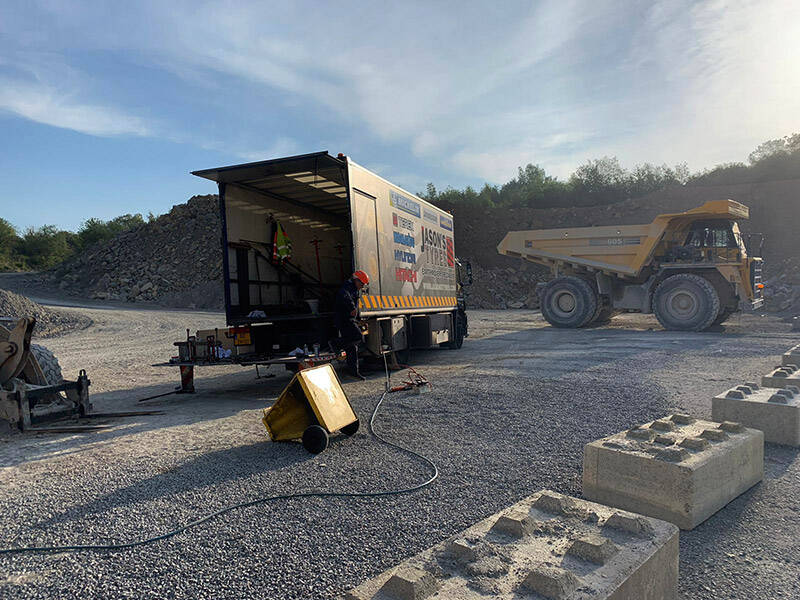 Early morning job mounting 35/65R33 on CAT 988K at location by team Jason's Tyres